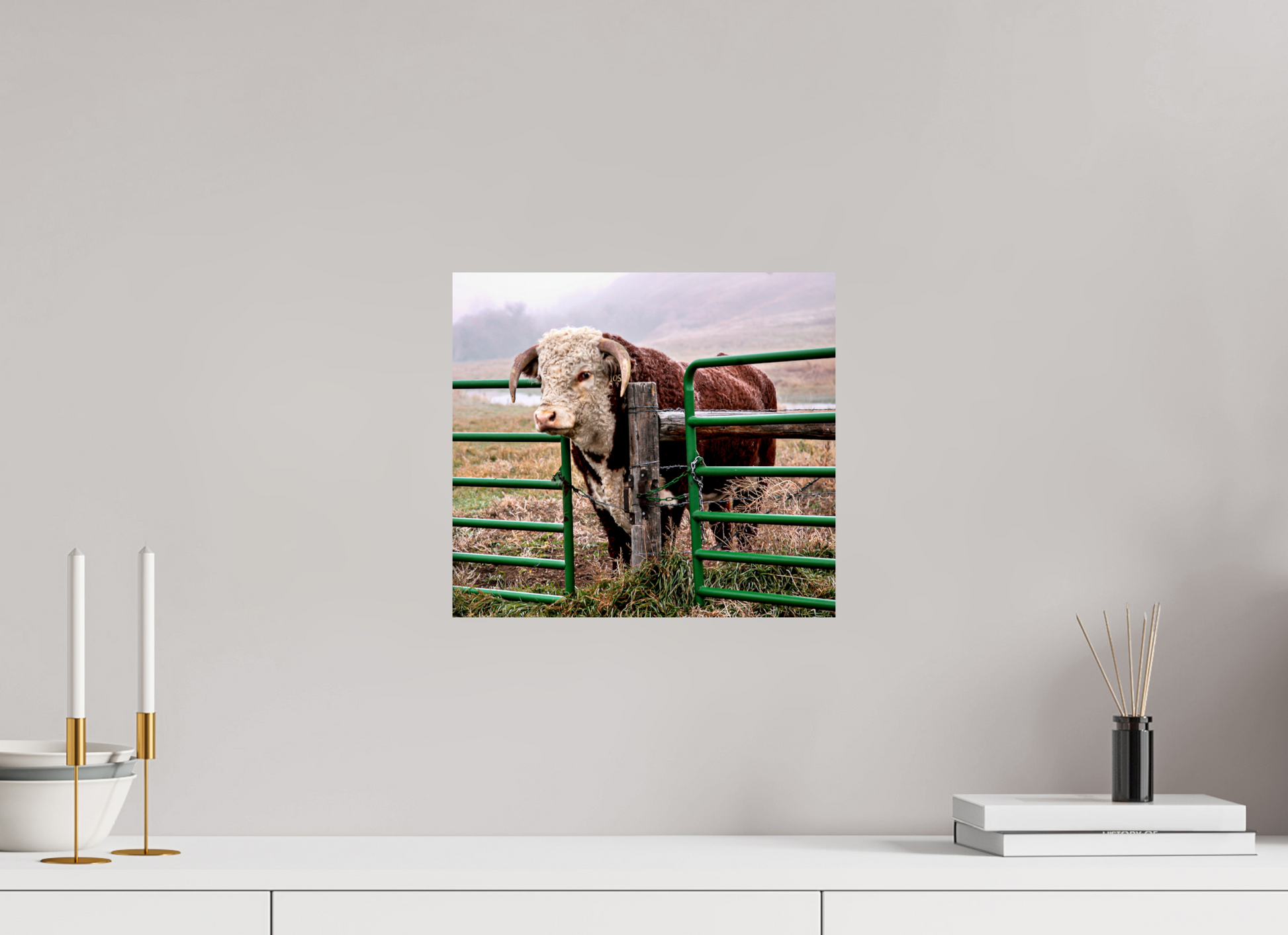 “The Honor System” captures a moment of quiet power in the open pastures of Wyoming. A massive bull stands behind a loosely chained gate—easily pushable, yet untouched. Many bulls would break through, but this one stays put, honoring an unspoken code of trust. Misty hills and a nearby stream add serenity, making this fine art print a tribute to restraint, dignity, and rural tradition. Printed on archival-quality paper, it’s perfect for collectors, ranchers at heart, and anyone drawn to the quiet strength of the land.